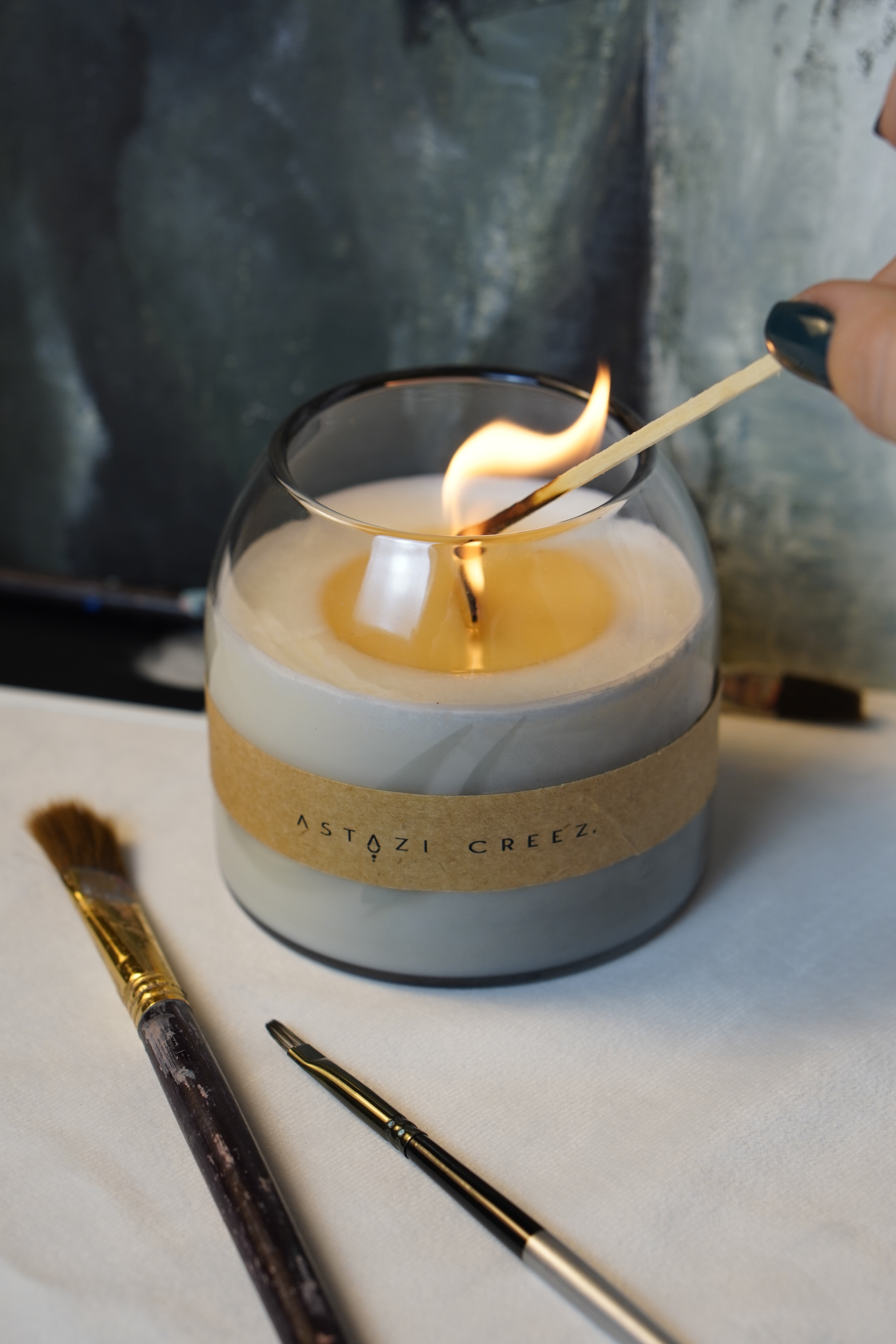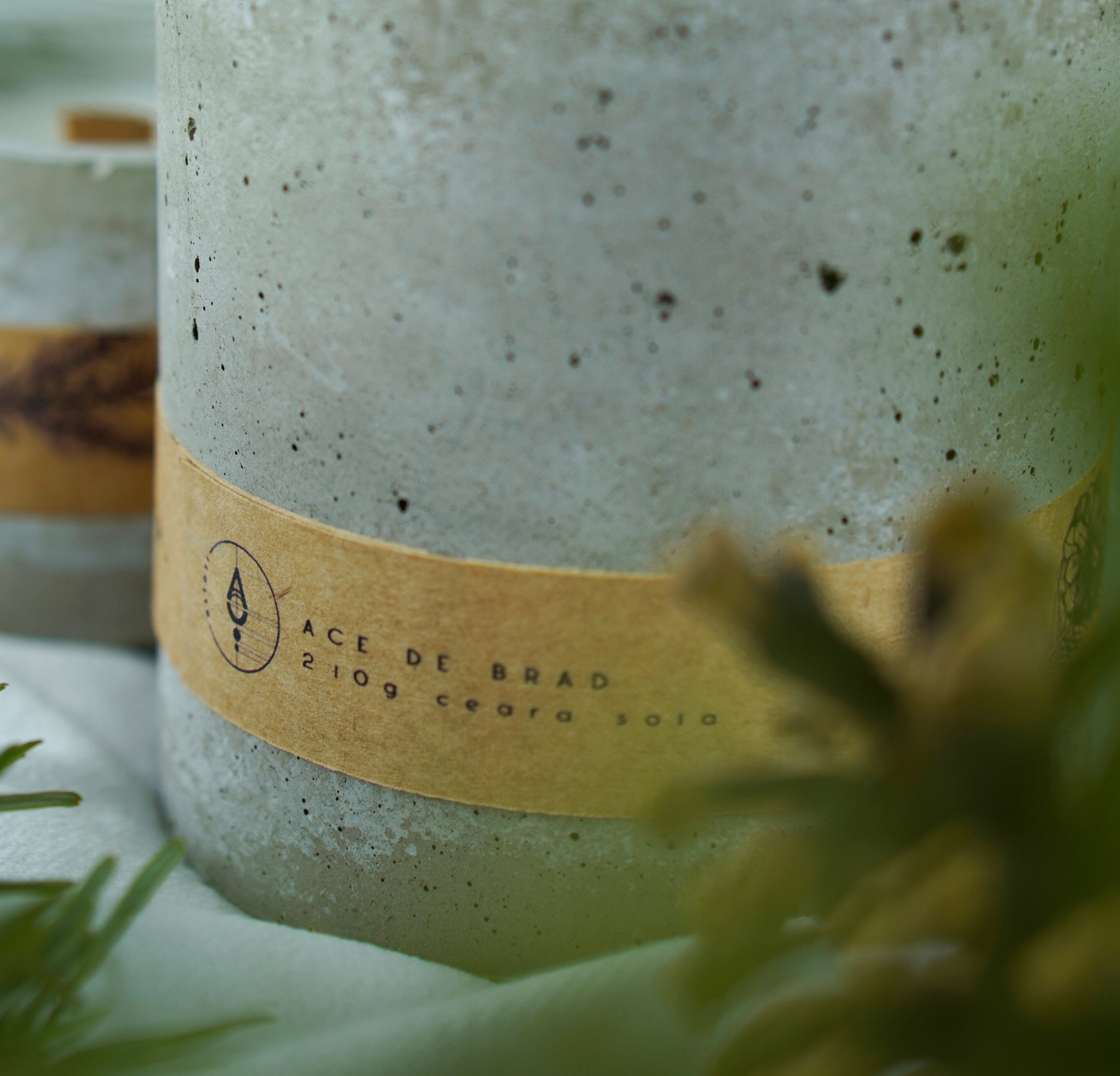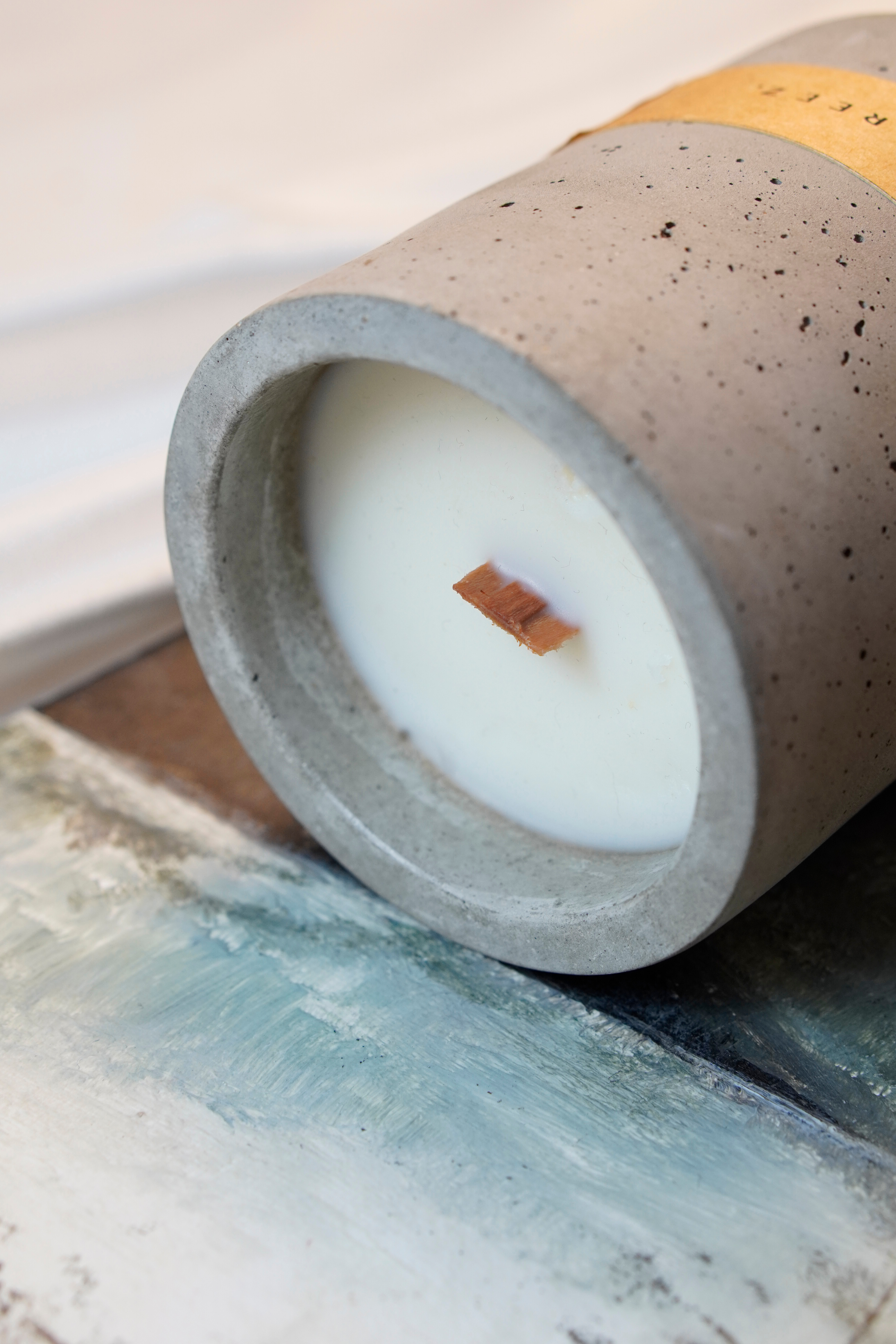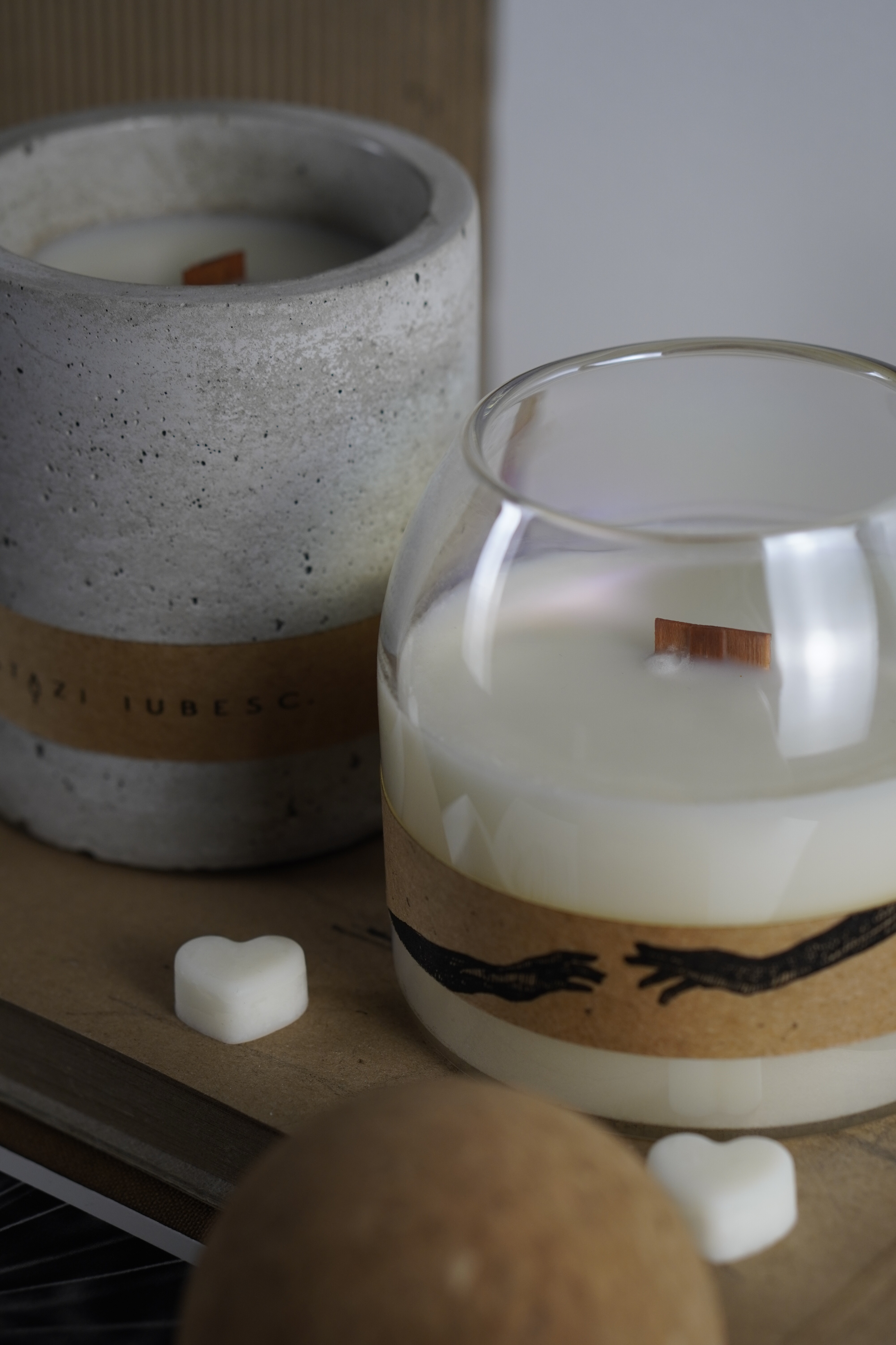 Materiale: ceară soia și cocos, fitil lemn, sticlă/beton